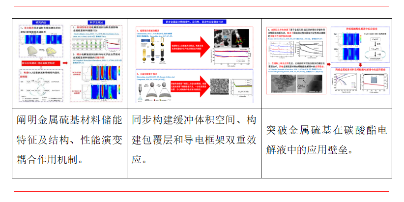 一、联用同步辐射在线检测技术和原位X射线吸收光谱技术,构建Cu2S容量衰减和物相结构演变新模型,揭示了电解液溶剂结构和电化学反应界面对金属硫基材料储能性能的关键作用,填补了金属硫基材料异质性储能机制的理论空白。